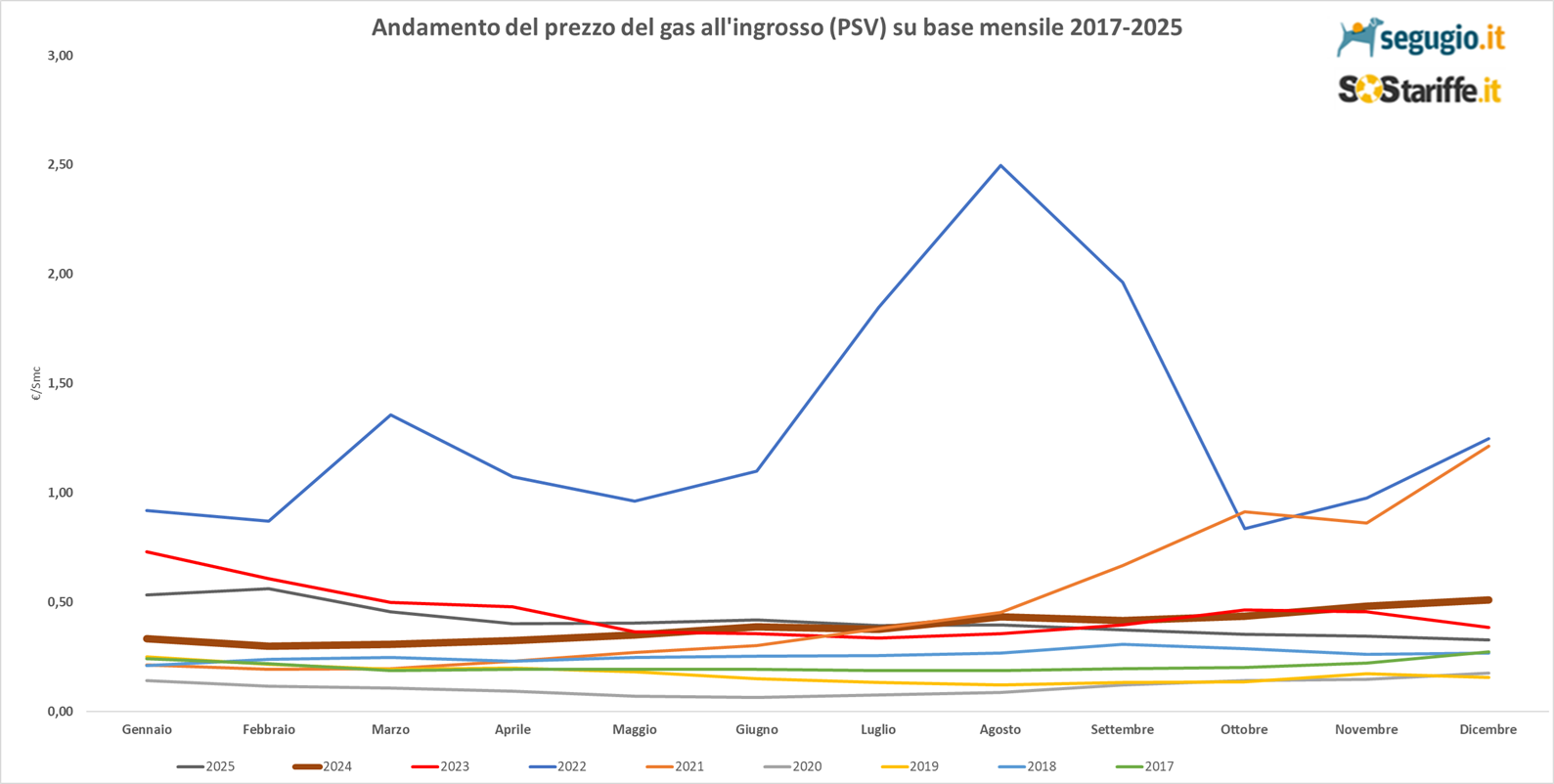 L’andamento del prezzo del gas all’ingrosso in Italia è un esempio del modo in cui il prezzo del gas è cambiato in Europa in questi ultimi anni, fino ad arrivare alla crisi del mercato energetico del biennio 2021-2022. Qui di sotto viene mostrato l’andamento del PSV su base mensile, fino a dicembre 2025: