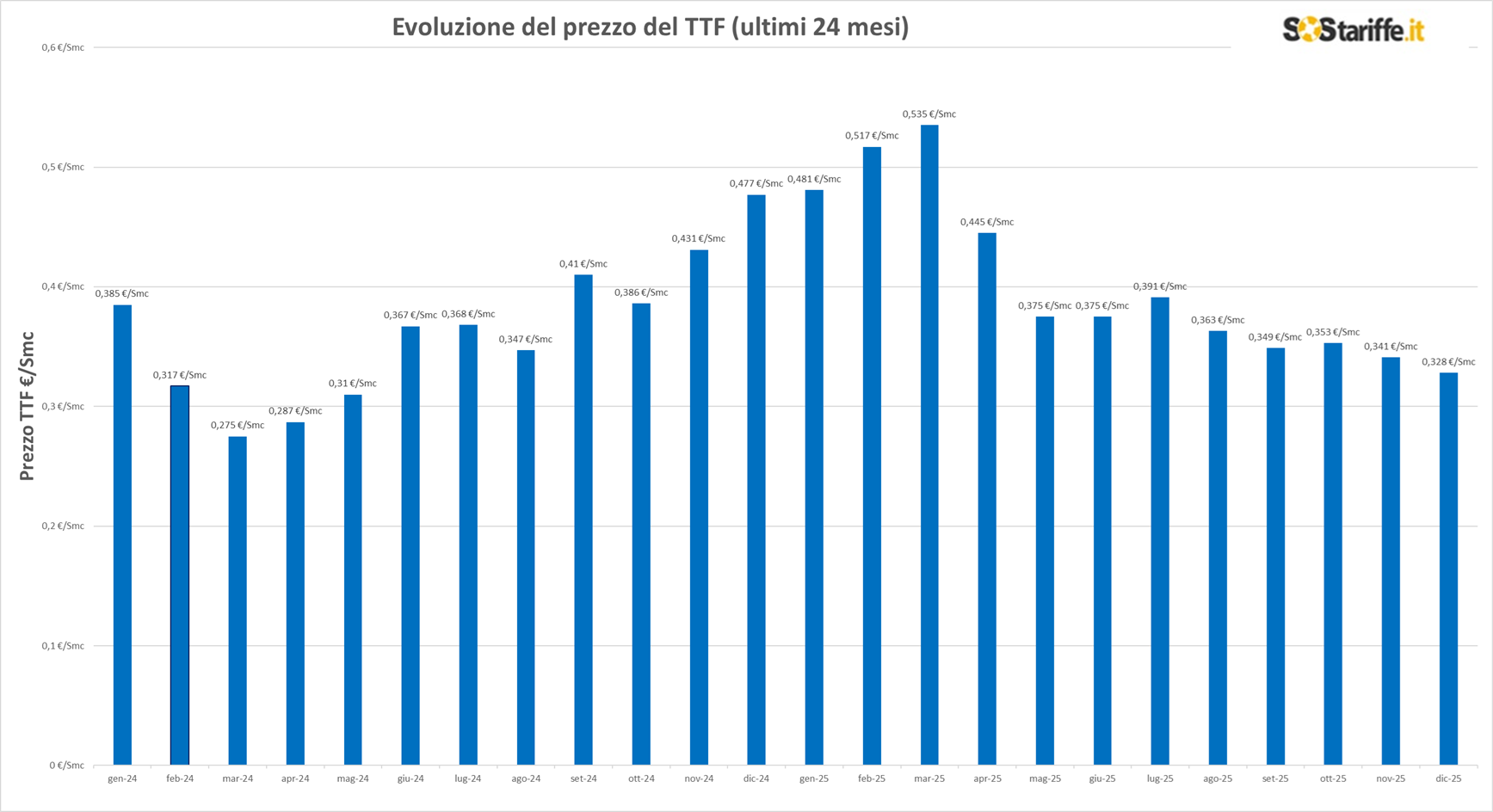 Il 2024 è iniziato con un ulteriore calo del prezzo: a gennaio 2024, infatti, il TTF è sceso a 0,38 €/Smc. Tra marzo e aprile 2024, inoltre, il TTF si è attestato al di sotto di 0,3 €/Smc. Successivamente, fino a luglio 2024, il TTF si è mantenuto al di sotto di 0,4 €/Smc. Successivamente il prezzo è aumentato, arrivando poco sotto quota 0,5 €/Smc con il dato di dicembre 2024 pari a 0,477 €/Smc